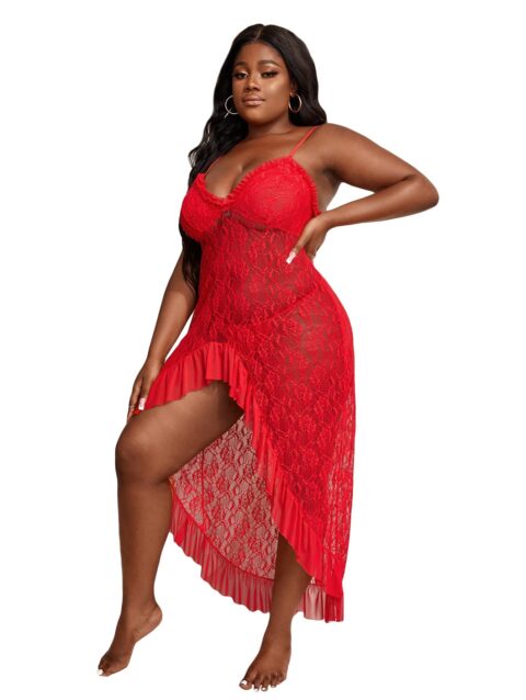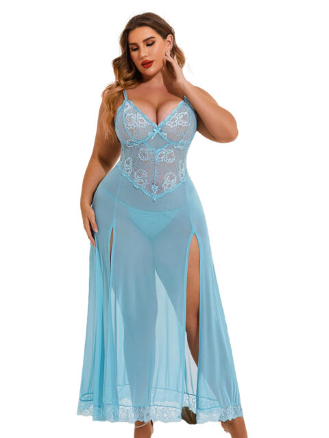Queenabel Plus Size Sexy Lace Sleeveless Split Long Mesh Lingerie Dress With Thong