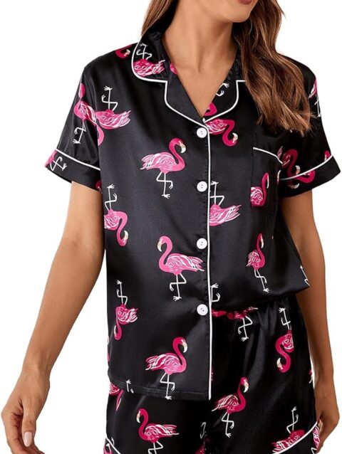 Queenable Women’s Satin Printed Pajama Set – Short Sleeve Button Down Shirt & Shorts Nightwear