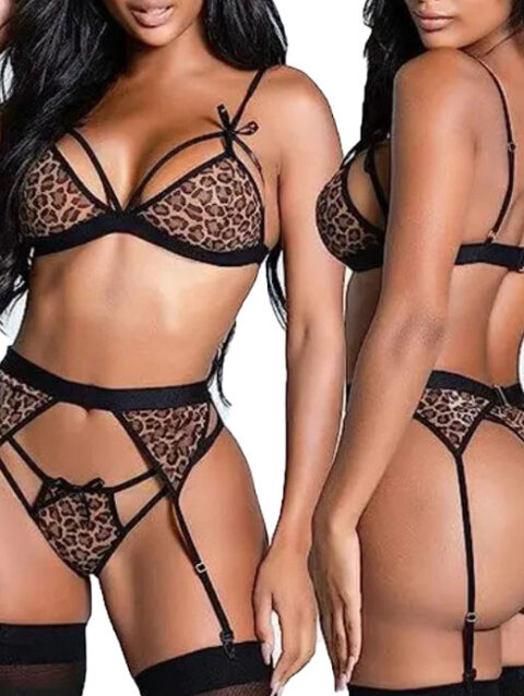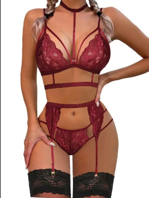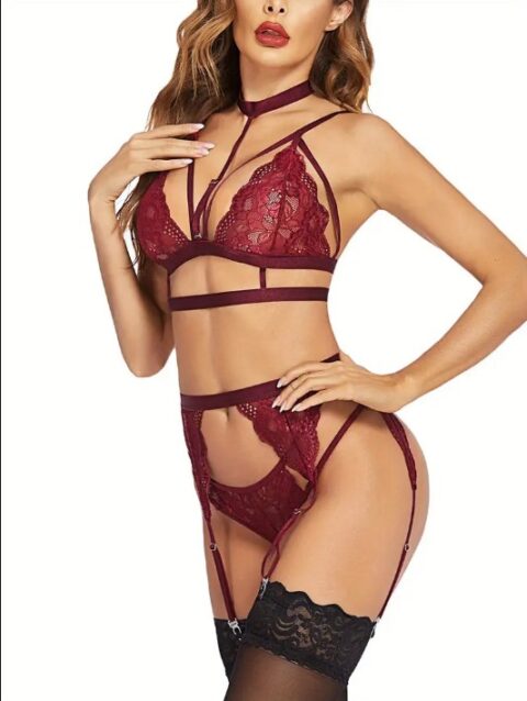 Queenabel Women’s Sexy 3-Piece Lace Lingerie Set with Garter Belt